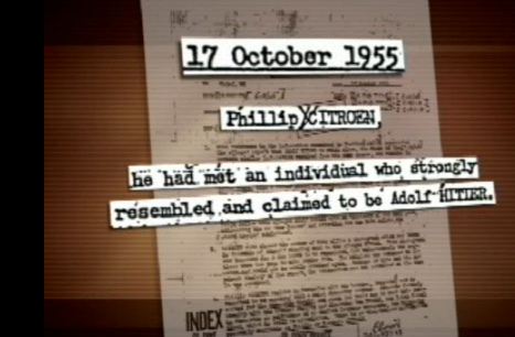 Ela disse que se chamava Julie Monteverio, que tinha morado na Argentina e que era filha de um ex-chefe do Serviço Secreto que cuidava de toda a segurança interna da Argentina. Disse-me que ela e seu pai, um dia, almoçavam em um dos vários restaurantes ao ar livre e que ele, repentinamente, disse-lhe: "Julie, você está vendo aquele homem ali, lendo o jornal?" Ela respondeu, "Sim, papa", e que ele disse que este homem era muito importante, que seu nome era Adolf Hitler e que a mulher sentada ao seu lado era sua esposa, Eva Braun. Não preciso dizer que fiquei muito feliz ao obter a confirmação de que Hitler estava vivo e morando na Argentina. Nesta época ele estava com 80 anos. Supõe-se que ele viveu até os 98 anos de idade.